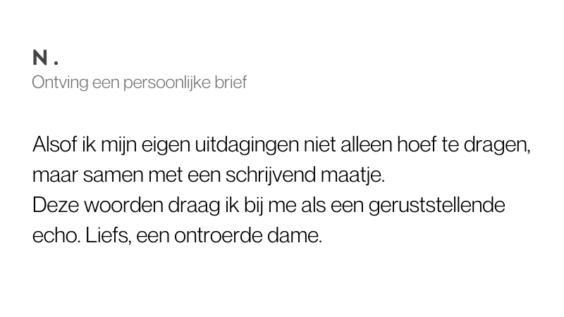 Mensen deelden soms een woord, soms een zin, soms een heel verhaal. Ik schreef mensen die ik niet kende en vond daarin delen van mezelf, en van ons allemaal. En misschien is dat wel de grootste heling: onszelf herkennen in de ander. De brieven herinnerden me eraan: onze hele menselijke ervaring is diep persoonlijk, en tegelijk universeel.
