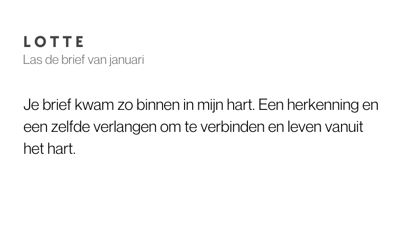 Als jij de volgende brief wilt ontvangen laat het me weten dan ontvang je een mail zodra de de postbus weer open gaat. En ontvang de audio-opname van de brief van januari in je inbox.